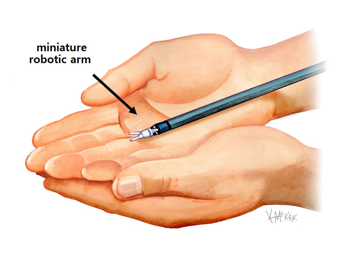 The latest Xi da Vinci® robot, has narrow instruments and a camera less than 8mm in width, allowing all ports to be less than 8mm in size. This has the advantage of smaller cuts and less pain and early discharge and return to normal activities. The ability of the camera to fit through any of the 8mm ports (a features not present with earlier da Vinci® models) also allows for greater freedom and interchange of instruments when required, making multi-quadrant surgery much easier.