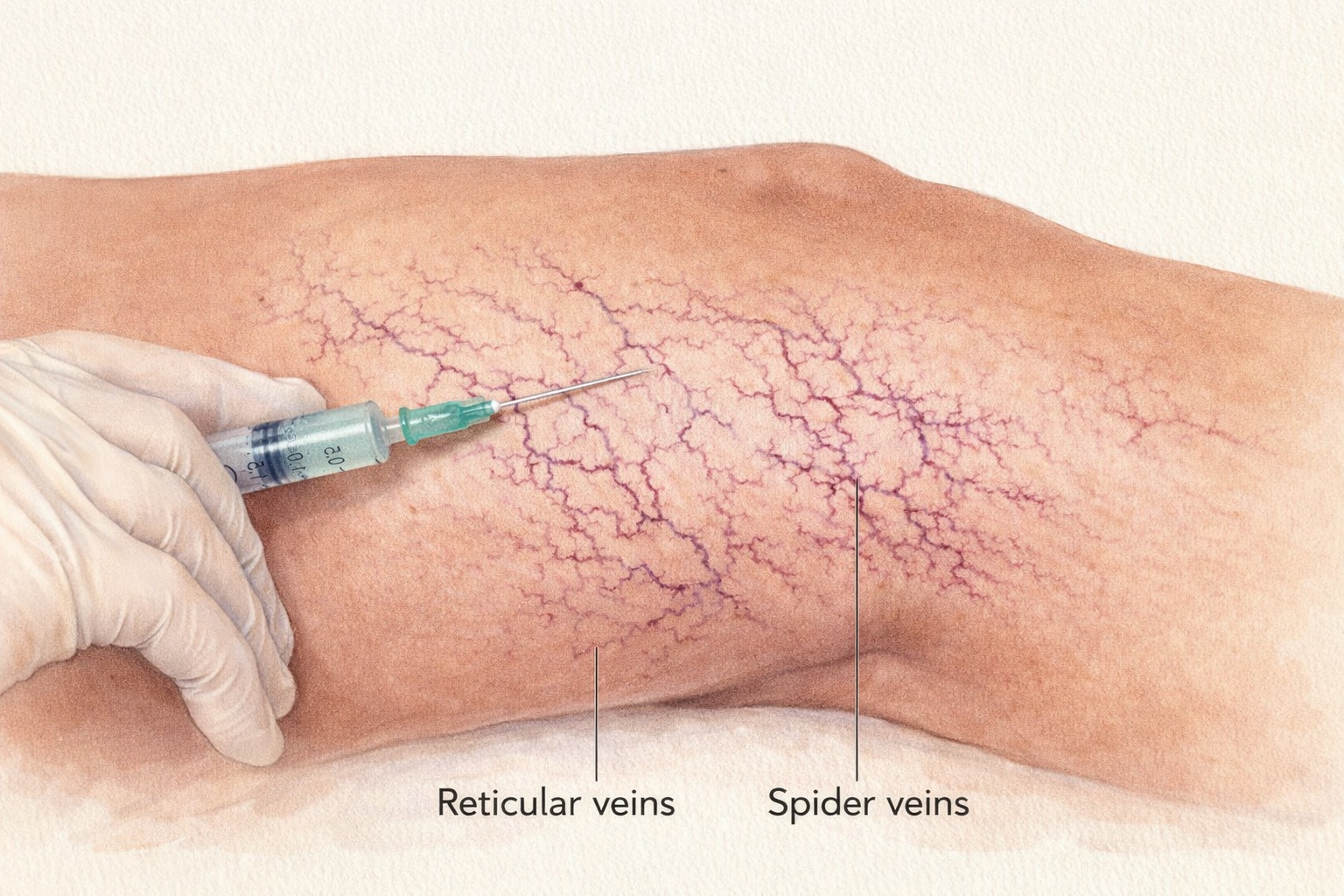 Sclerotherapy is a procedure in which a medication known as a sclerosant (for example, Aethoxysklerol) is injected directly into a vein using a very fine needle. The solution irritates the inner lining of the vein, causing it to collapse and seal closed. Over time, the body naturally absorbs the treated vein.